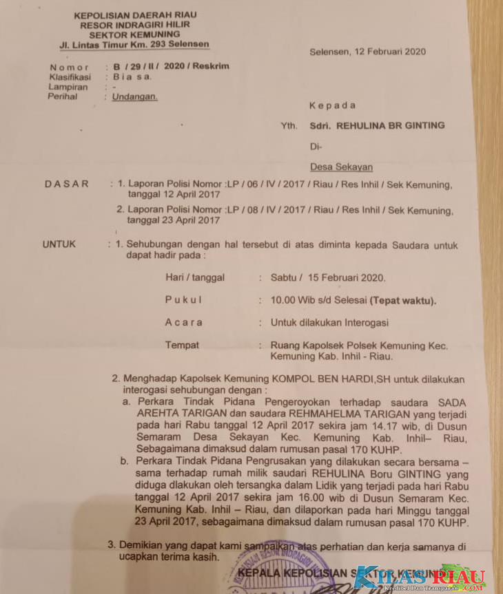 Dimana pelaporan tersebut tertulis sangat jelas bahwa isinya adalah menghadap Kapolsek Kemuning KOMPOL BEN HARDI, SH untuk dilakukan interogasi sehubungan dengan: