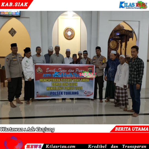 KILASRIAU.COM, Tualang – Personil Polsek Tualang -Polres Siak terus meningkatkan Cooling System menjelang pemilu 2024 di wilayah hukum Polsek Tualang. Kali ini di laksanakan di Masjid Nurul Hidayah km.6 Kecamatan Tualang Kabupaten Siak bersama Jamaah Masjid, Sabtu ( 20/01/2024).