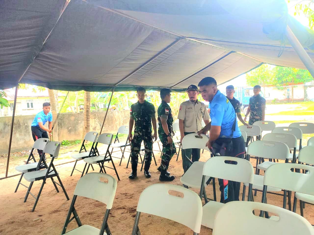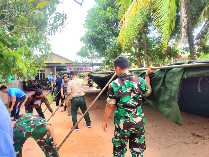 Selain peminjaman tenda, Lanud RSA juga turut membantu dalam pemasangan tenda di lokasi TPS. Anggota Lanud RSA bersama-sama dengan warga sekitar bahu-membahu mendirikan tenda agar siap digunakan pada saat pemungutan suara.
