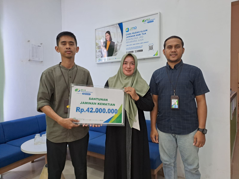 KILASRIAU.com  - Badan Penyelenggara Jaminan Sosial (BPJS) Ketenagakerjaan Cabang Indragiri Hilir menyalurkan santunan Jaminan Kematian (JKM) sebesar 42 juta Rupiah kepada ahli waris penyuluh agama yang bertugas di Kecamatan Gaung Anak Serka (GAS) Kabupaten Indragiri Hilir atas nama Alm Yahdi. Santunan tersebut diberikan sebagai bentuk kepedulian dan bantuan kepada keluarga yang ditinggalkan, sebagai dampak dari kepergian penyuluh agama yang telah lama mengabdikan diri dalam melayani masyarakat.