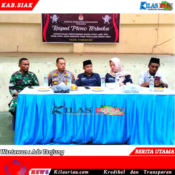 KILASRIAU.COM, Tualang — Rapat pleno terbuka rekapitulasi perhitungan suara PPWP, DPR RI, DPRD Provinsi, DPRD Kabupaten/Kota pada Pemilihan Umum 2024 mulai digelar hari ini pukul 13.00 wib di Gor Tualang. Terlihat hadir pada rapat pleno tersebut antara lain Mursal S.Sos Camat Tualang, Kompol Arry Prasetyo SH.MH Kapolsek Tualang, Dandramil yang diwali oleh Sertu TH.Hutagalung, Suwito Panwaslu Kec. Tualang, Yulastry Maria Siska Ketua PPK serta anggota PPK Kec. Tualang, PPS dari masing-masing Kampung di Kec. Tualang, dan saksi dari partai, Minggu (18/02/2024).