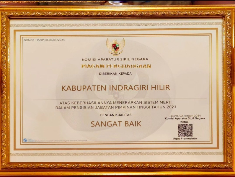 Kabupaten Indragiri Hilir termasuk 2 (dua) Pemerintah Kabupaten/Kota yang menerima penghargaan dengan Kategori SANGAT BAIK bersama Pemko Pekan baru yang diterima oleh Pj.Sekda Kabupaten Inhil, Ir.Ery Putra dari Komisioner KASN.