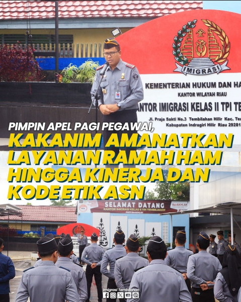KILASRIAU.com - Kantor Imigrasi Kelas II TPI Tembilahan (Imigrasi Tembilahan) pagi ini melaksanakan rutinitas Apel Pagi pegawai yang dipimpin langsung oleh Kepala Kantor Imigrasi (Kakanim) Tembilahan, Nanang Mustofa.