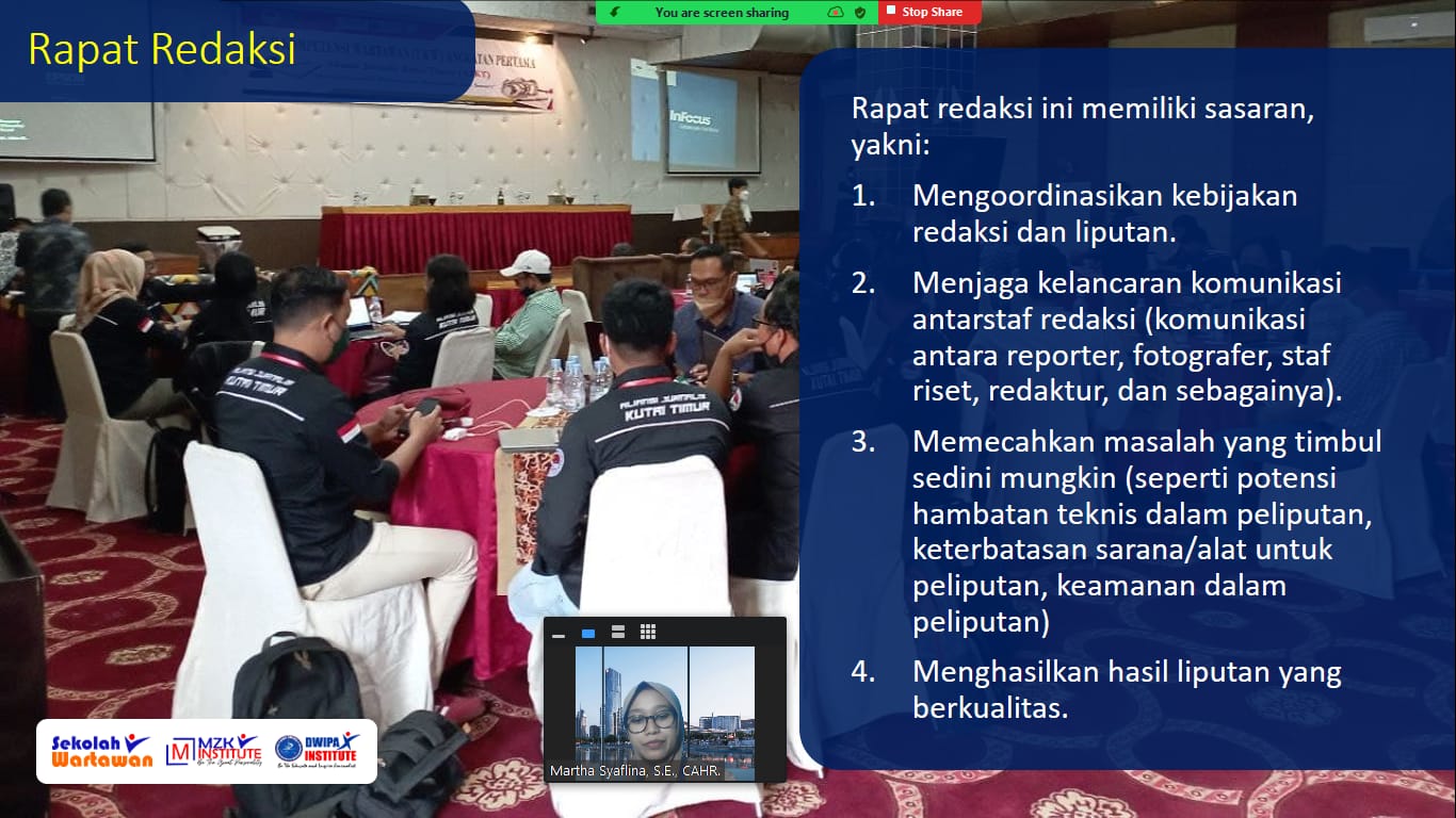 Sesi bimbingan UKW ini diisi oleh tim dari MZK Institute. Sebuah lembaga yang sudah terbukti melatih banyak wartawan yang berkompeten setelah UKW. Pematerinya Martha Syaflina, S.E., CAHR. selaku mentor dari Sekolah Wartawan MZK Institute.