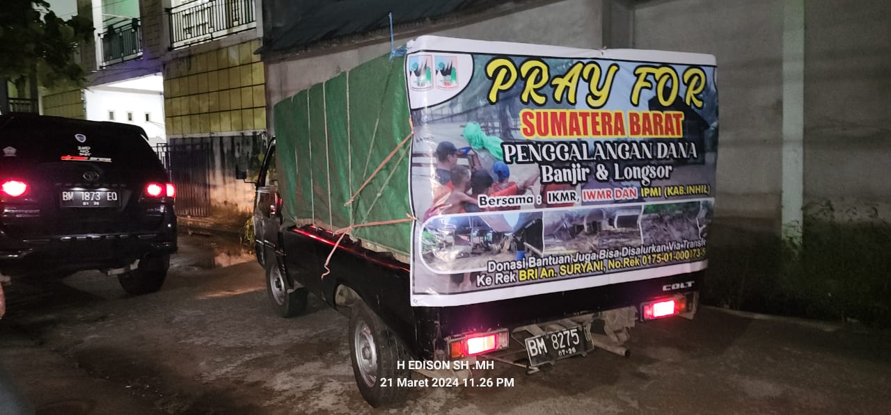 Sampai saat ini, Kamis, 21 Maret 2024 tim dari IKMR, IWMR, dan IPMI sudah berangkat menuju Sumatra Barat untuk menyerahkam bantuan senilai Rp.22.000.000 dan 100 paket sembako menuju ke lokasi Banjir dan tanah longsong.
