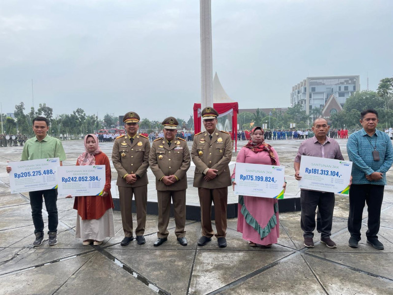 Usai apel, dilaksanakan penyerahan santunan atau penerima manfaat beasiswa Jaminan Kecelakaan Kerja (JKK) dari BPJS Ketenagakerjaan.