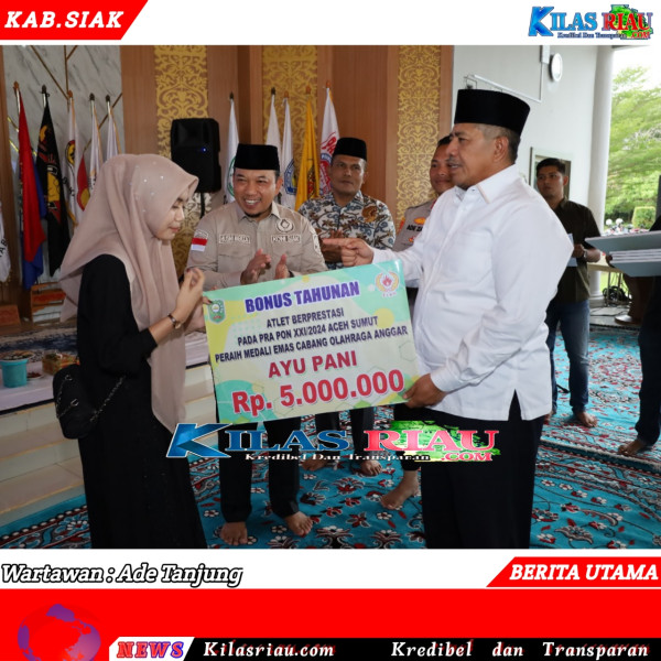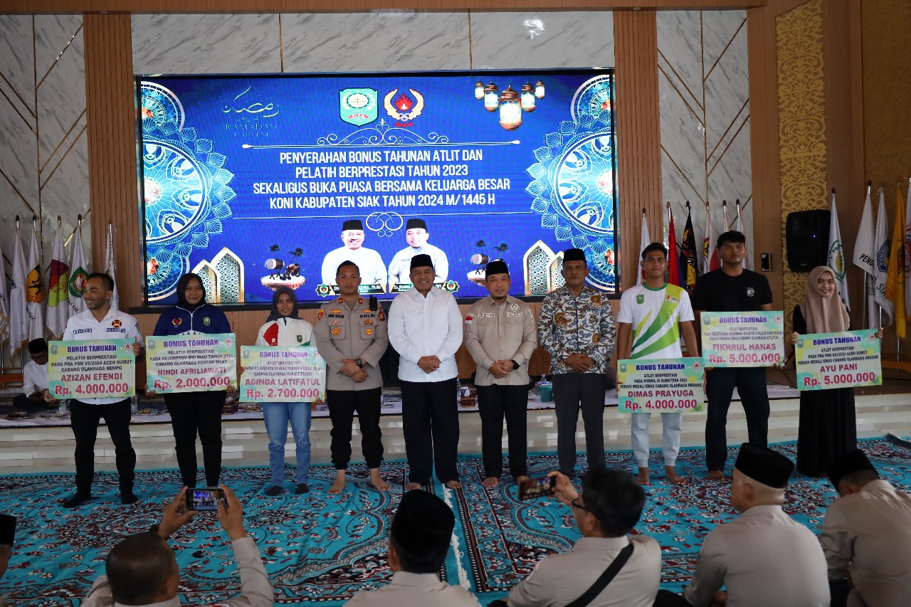 KILASRIAU, Siak — Sebanyak 109 atlet dan pelatih berprestasi Kabupaten Siak menerima bonus tahunan dari Komite Nasional Indonesia (KONI) Siak. Penyerahan bonus tahunan diserahkan secara simbolis oleh Bupati Siak Alfedri MSi didampingi Ketua Umum KONI Siak Husni Merza MM pada acara buka puasa bersama keluarga KONI Kabupaten Siak Tahun 2024 di Balairung Datuk Empat Suku Komplek Abdi Praja Siak Sri Indrapura, Rabu (03/04/2024).