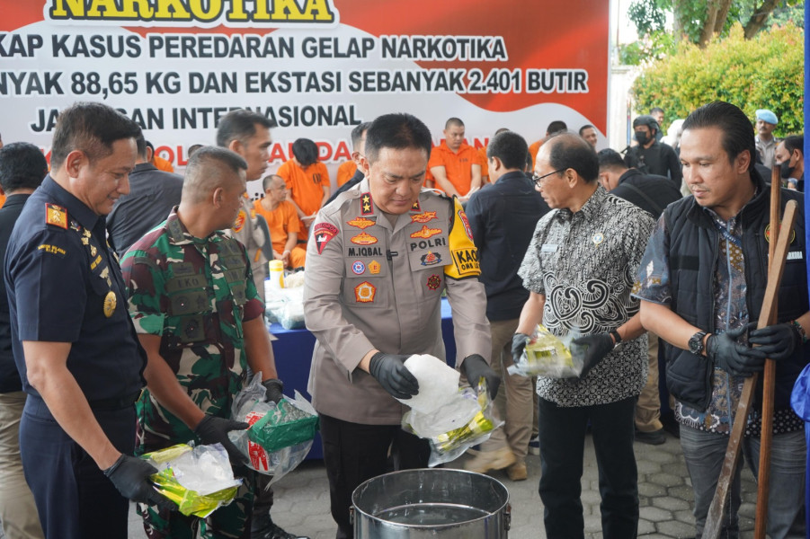 KILASRIAU.com - Polda Riau melaksanakan pemusnahan barang bukti narkotika hasil pengungkapan dari jaringan internasional, Jumat (26/4/2024). Barang bukti yang dimusnahkan yakni 88,65 kilogram sabu dan 2.401 butir pol ekstasi.