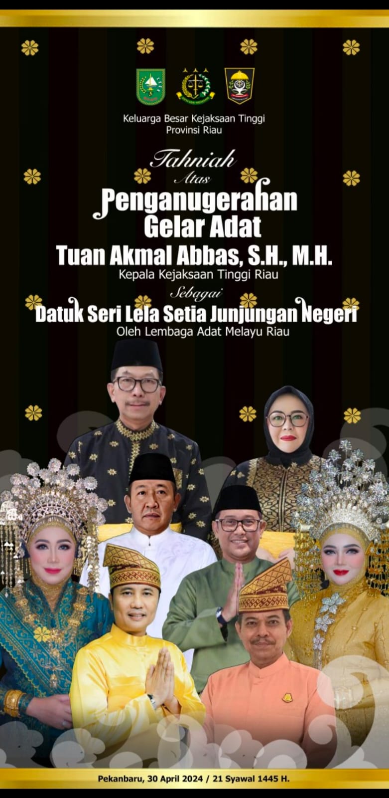 Besok, Kajati Riau Akmal Abbas, SH. MH Dianugerahi Gelar Adat Datuk Seri Lela Setia Junjungan Negeri