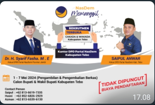 KILASRIAU.com - Gratis Pendaftaran Calon Kepala Daerah Tebo, DPD Partai NasDem kabupaten Tebo, mulai tanggal 1 sampai 7 mei 2024, membuka kesempatan bagi Bakal Calon Kepala Daerah dan Wakil Kepala Daerah.