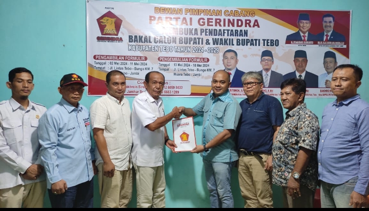 KILASRIAU.com - Bakal Calon Bupati Tebo (Bacabup) Tebo periode 2024-2029, Agus Rubiyanto (ARB) di hari pertama pembukaan pendaftaran bakal calon bupati dan wakil bupati tebo yang dibuka oleh Partai Gerindra langsung mengambil formulir.