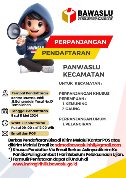 Berkaitan dengan adanya perpanjangan ini Bawaslu Inhil mengajak kepada siapapun yang telah memenuhi syarat dan ketentuan untuk menjadi penyelenggara pengawas Pemilihan Ayo segera daftarkan diri anda untuk menjadi bagian mensukseskan Pemilihan Kepala Daerah serentak.tegasnya