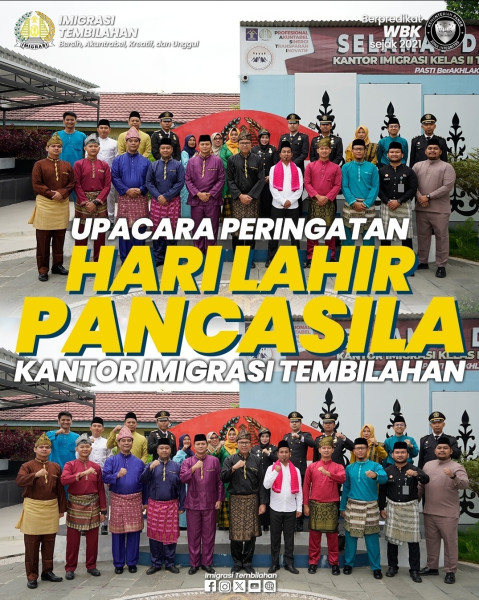 Memakai pakaian adat nasional, seluruh pejabat dan pegawai Kantor Imigrasi Tembilahan laksanakan upacara peringatan Hari Lahir Pancasila yang jatuh pada tanggal 1 Juni 2024.