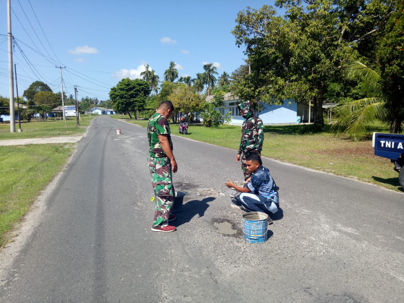 Cegah Kecelakaan, TNI AU Lanud RSA Natuna Inisiatif Tambal Jalan Berlubang