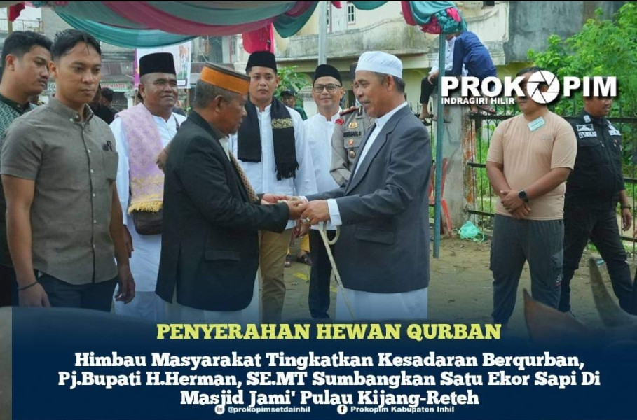 KILASRIAU.com, Pulau Kijang - Pj.Bupati H.Herman, SE. MT ke Pulau Kijang Kecamatan Reteh tidak hanya melaksanakan Sholat Idul Adha, tetapi juga menyumbangkan satu ekor sapi kepada Pengurus Mesjid besar Jami' Pulau Kijang, Senin (17/6/2024)