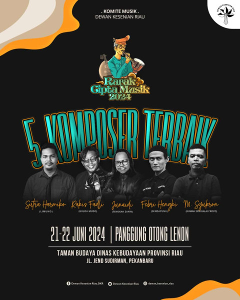 Ke-5 komposer terpilih pada Rarak Cipta Musik Dewan Kesenian Riau 2024 itu masing-masing adalah: