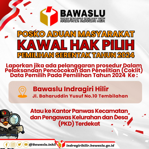 Kordinator Divisi Pencegahan, Parmas dan Humas Bawaslu Kabupaten Indragiri Hilir Abus Siraj, S.Pt mengatakan Bahwa Menindak lanjuti Intruksi Bawaslu Republik Indonesia mengenai Kawal Hak Pilih Hari ini Bawaslu Kabupaten Indragiri Hilir membuka posko di Bawaslu Kabupaten, dan di 20 kecamatan yang terpusat di kantor pengawas Kecamatan, serta di 236 desa dan keluarahan di seluruh kabupaten Indragiri Hilir tepatnya di rumah pengawas kelurahan dan desa (PKD).