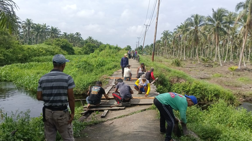 KILASRIAU.com - Pemerintah Desa (Pemdes) Wonosari, Kecamatan Pelangiran bersama warga melaksanakan kegiatan gotong royong perbaikan jembatan kanal 12 dusun Banjar Sari, Senin (1/7/24).