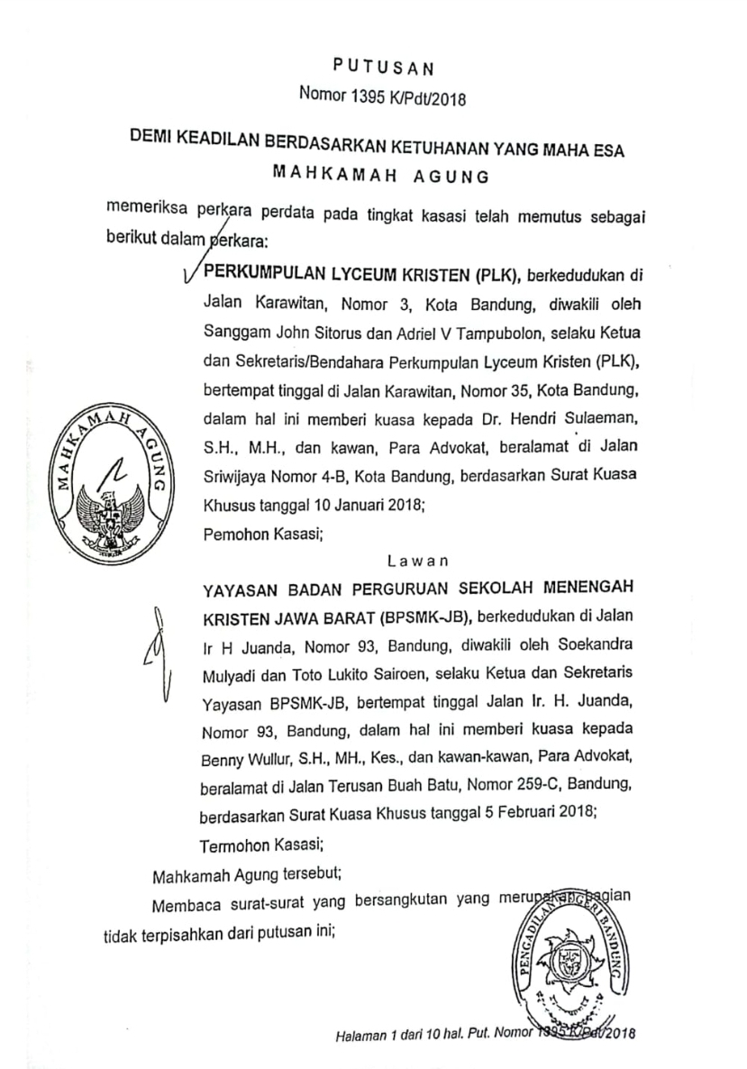 Selanjutnya, pada tahun 2002 PLK telah mengajukan gugatan TUN kepada Depkeu dan BPSMK, yang kemudian berkekuatan hukum tetap pada 2008. Lalu, oleh pihak Peradilan TUN, Depkeu diperintahkan untuk memproses pengeluaran aset milik PLK dari daftar aset negara berupa tanah seluas 20.905 meter persegi berikut bangunan sekolah di Jalan Ir. H. Juanda nomor 93, Kota Bandung.