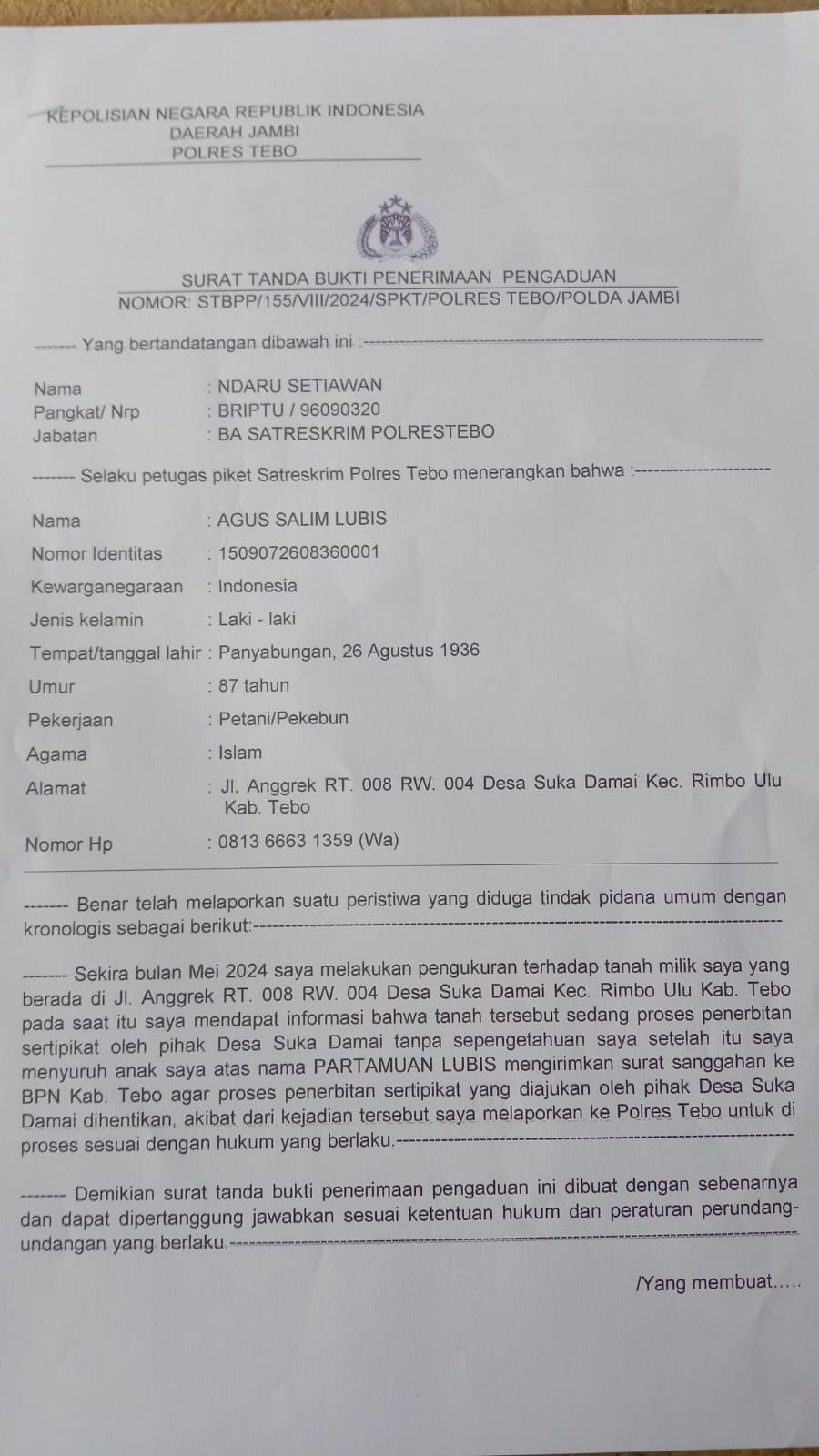 Ketika kami mengetahui desa membuat sertifikat Tanah milik kami. Berapa bulan lalu kami mau bikin sertifikat pada BPN Tebo sampai pengukuran dan menunggu waktu kapan jadi sertifikat kami, Ternyata kami menerima informasi dari Rudi pihak BPN Tanah milik kami telah di ajukan permohonan pembuatan sertifikat atas nama desa suka damai.