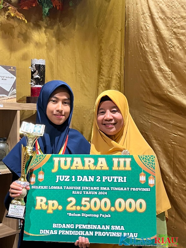 TELUK KUANTAN, (KILASRIAU.Com) - Nursepira Ramadhani Siswi Kelas XI¹ Sekolah Menengah Atas Negeri 2 (SMAN 2) Teluk Kuantan berhasil mengharumkan nama Kabupaten Kuantan Singingi di kancah seleksi lomba tahfidz tingkat Provinsi Riau jenjang SMA setelah meraih juara III.