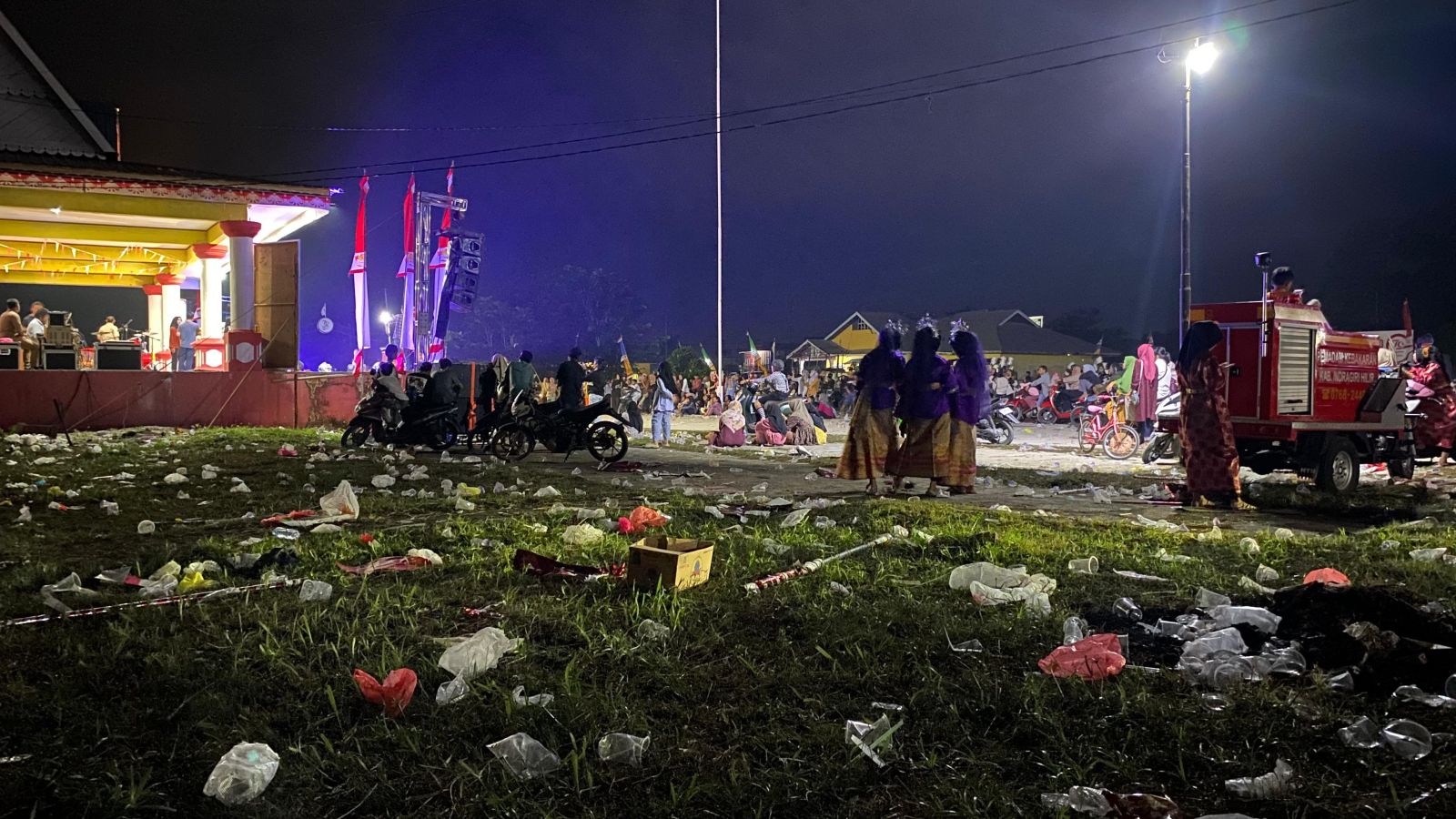 Tak hayal usai acara peringatan yang digelar dengan meriah, sisa-sisa keceriaan tersebut malah teringgal dalam bentuk tumpukan sampah yang berserakan di sekitar balai rakyat Sunagi Guntung.