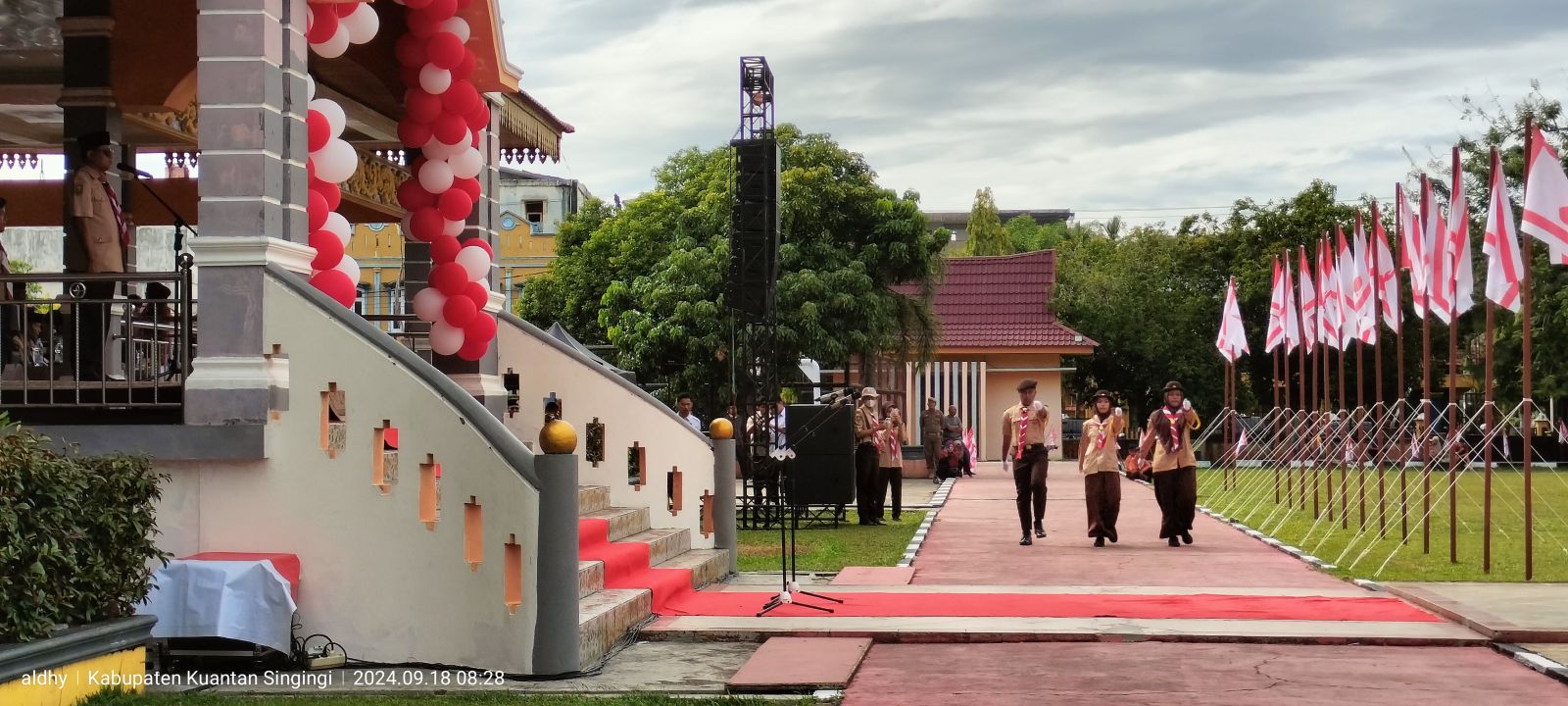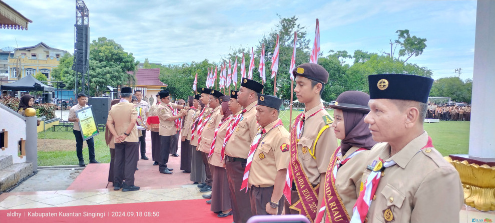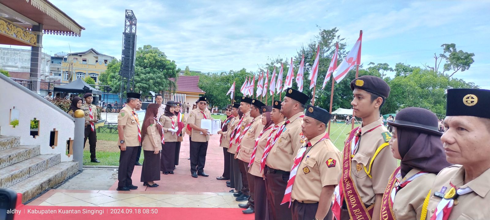 TELUK KUANTAN (KILASRIAU.Com) - Bupati Kuantan Singingi, Dr. H. Suhardiman Amby,Ak., MM menghadiri kegiatan upacara peringatan Hari Pramuka Ke-63 tahun 2024, sekaligus penyerahan Piagam Penghargaan Pramuka, di Lapangan Limuno Teluk Kuantan, Rabu, (18/09/2024).