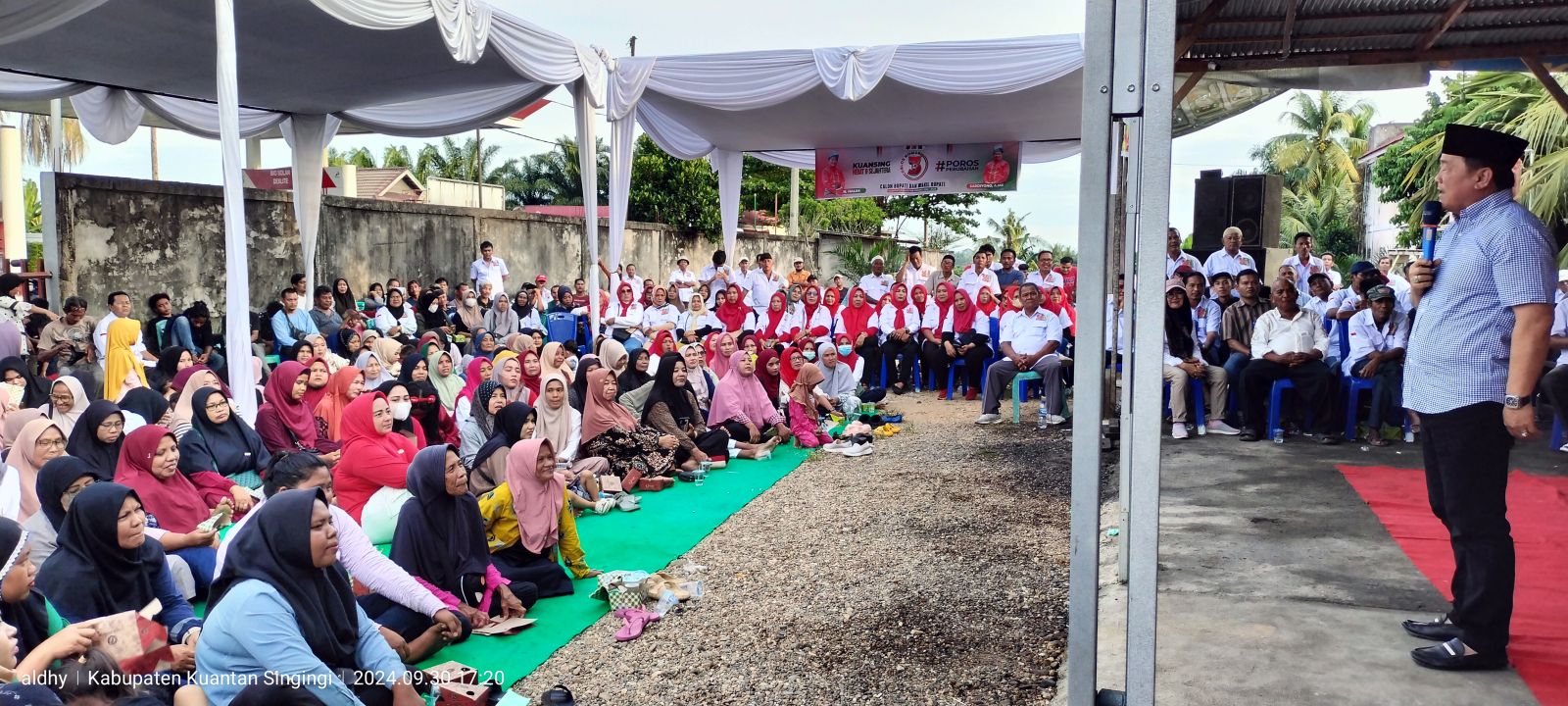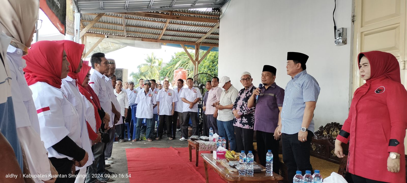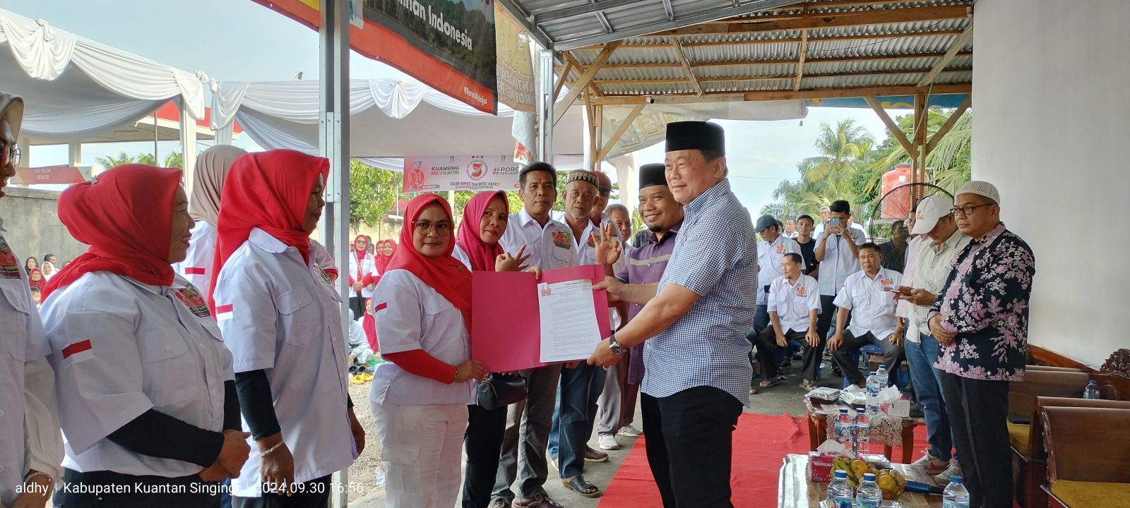 TELUKKUANTAN (KILASRIAU.Com) - Ratusan tim pemenangan pasangan calon bupati dan wakil bupati Kuantan Singingi, Halim-Sardiyono (HS) di Kenegerian Taluk, Kecamatan Kuantan Tengah, resmi dikukuhkan, di Sungai Jering, Senin (30/09/2024) sore.