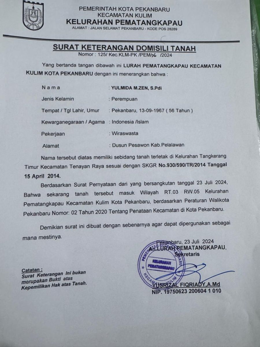 Tanah yang berlokasi di wilayah RT 03 RW 05, Kelurahan Pematang Kapau, Kulim Kota Pekanbaru tersebut statusnya hendak dinaikkan dari SKGR ke SHM, Namun hal tersebut terkendala akibat SKGR dengan No.930/590/TR/2024 tanggal 15 April 2014 tersebut hilang.