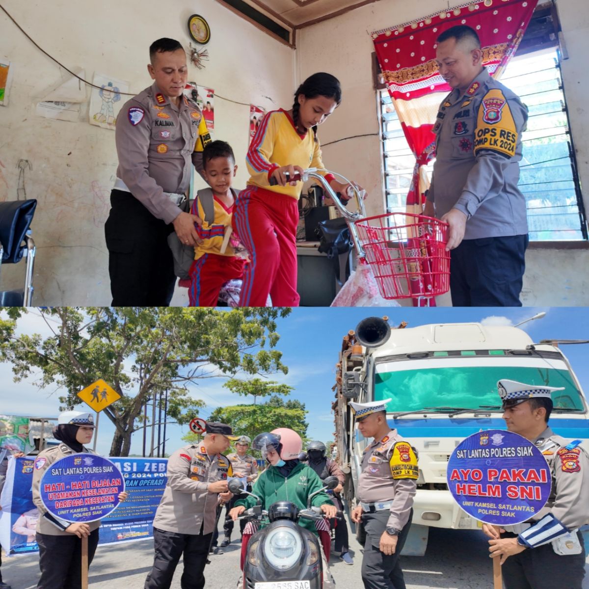 Dalam kegiatan Ops Zebra Kapolres Siak membagikan beberapa Helm dan pemberian leaflet keselamatan kepada pengguna jalan yang melintas.