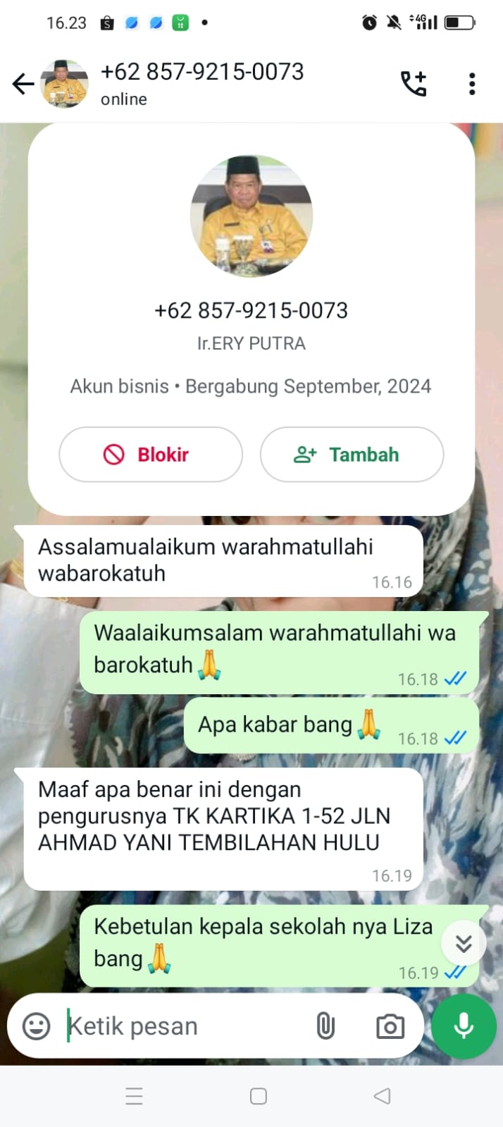 Didapatkan laporan bahwa terdapat oknum yang menggunakan nomor telepon seluler 0857 9125 0073 dan mengaku sebagai Penjabat (Pj) Sekda Indragiri Hilir.