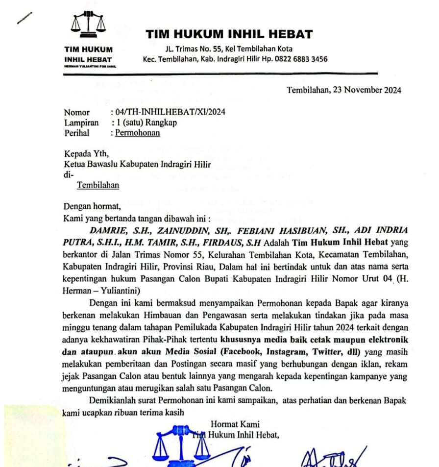 Permintaan yang dilayangkan melalui surat ini menurut tim Kuasa Hukum Inhil Hebat mengingat pentingnya menjaga integritas dan kejujuran dalam proses pemilihan Bupati dan Wakil Bupati Inhil pada 27 November.