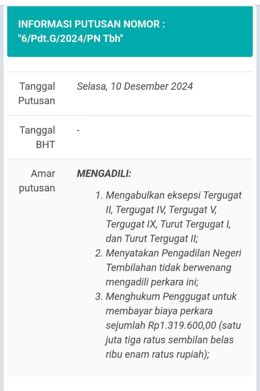 Ketua Majelis Hakim menyatakan bahwa Pengadilan Negeri Tembilahan tidak memiliki kewenangan untuk mengadili perkara ini. Amar putusan tersebut memuat beberapa poin penting: