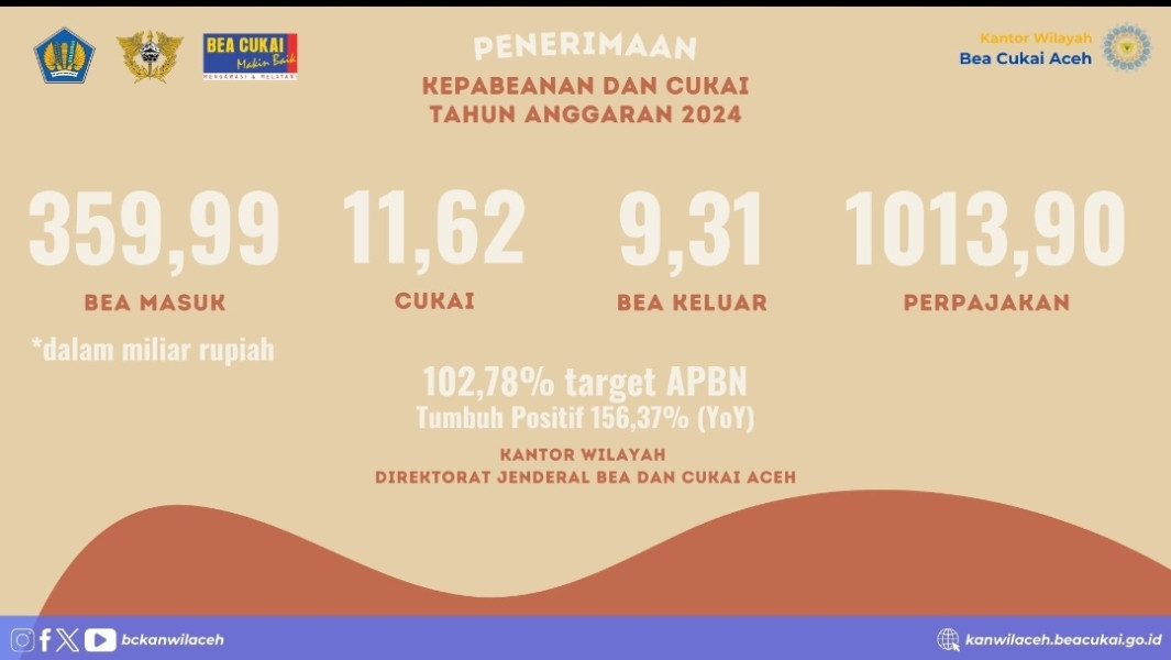 KILASRIAU.com - Kantor Wilayah (Kanwil) Direktorat Jenderal Bea dan Cukai (Bea Cukai) Aceh mencatat prestasi gemilang dengan melampaui target penerimaan negara Tahun Anggaran 2024 sebesar 102,78%. Total penerimaan mencapai Rp380,92 miliar, melampaui target APBN 2024 sebesar Rp370,61 miliar.