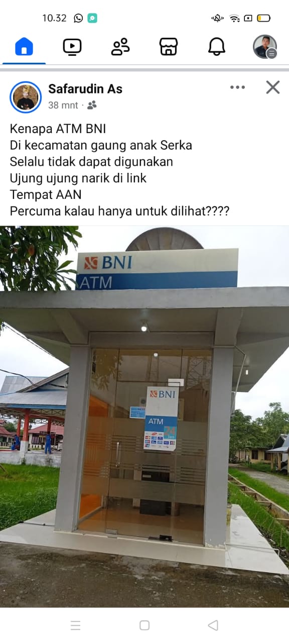 Dalam keterangannya, Safarudin menyampaikan ketidakpuasannya karena mesin ATM BNI di Kecamatan Gaung Anak Serka sering kali tidak berfungsi sebagaimana mestinya. Ia menuliskan: