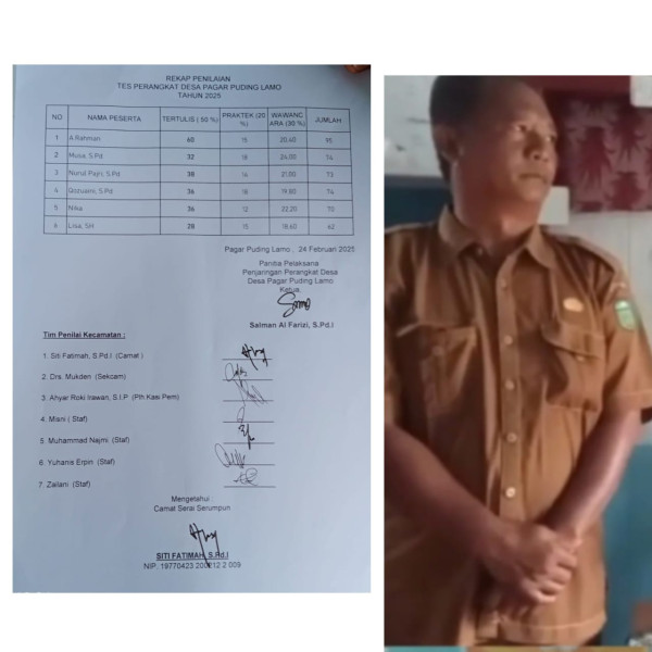 KILASRIAU.com, Pagar Puding Lamo – Penjabat (PJ) Kepala Desa Pagar Puding Lamo, Sudirman, diduga menerima uang dari salah satu peserta seleksi perangkat desa. Dugaan ini mencuat setelah adanya laporan bahwa proses penjaringan tidak transparan.