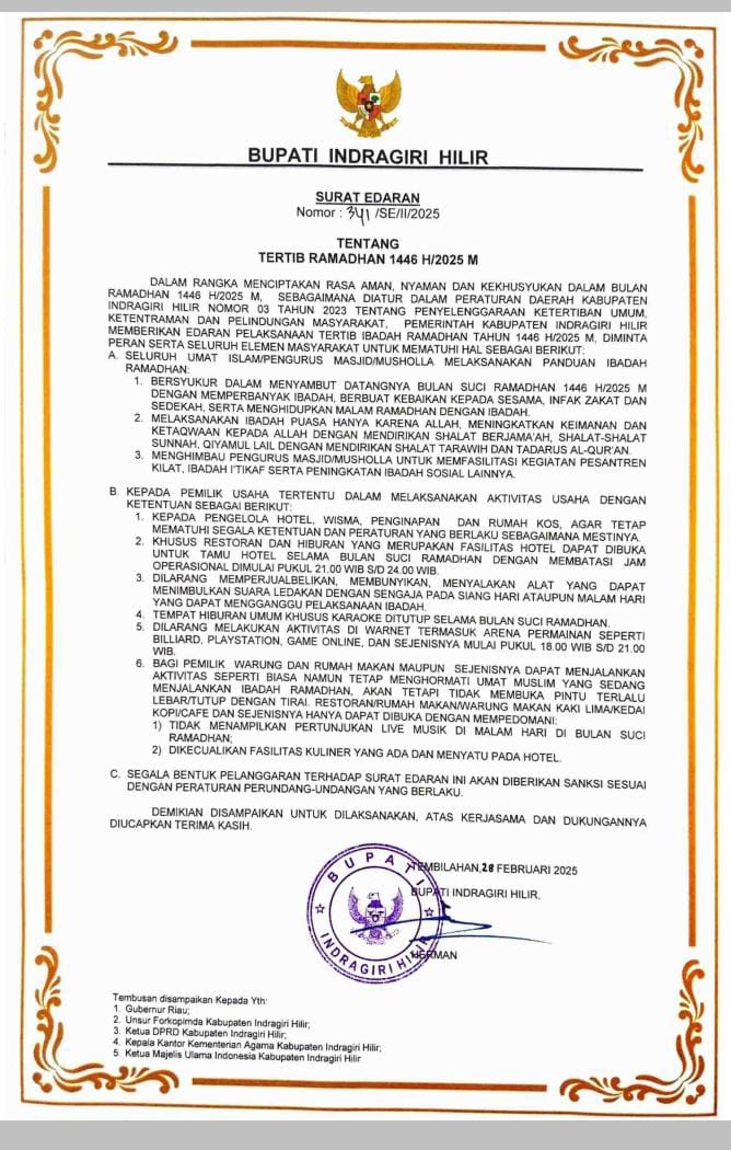 Surat Edaran Bupati Inhil Tentang Tertib Ramadhan 1446 M