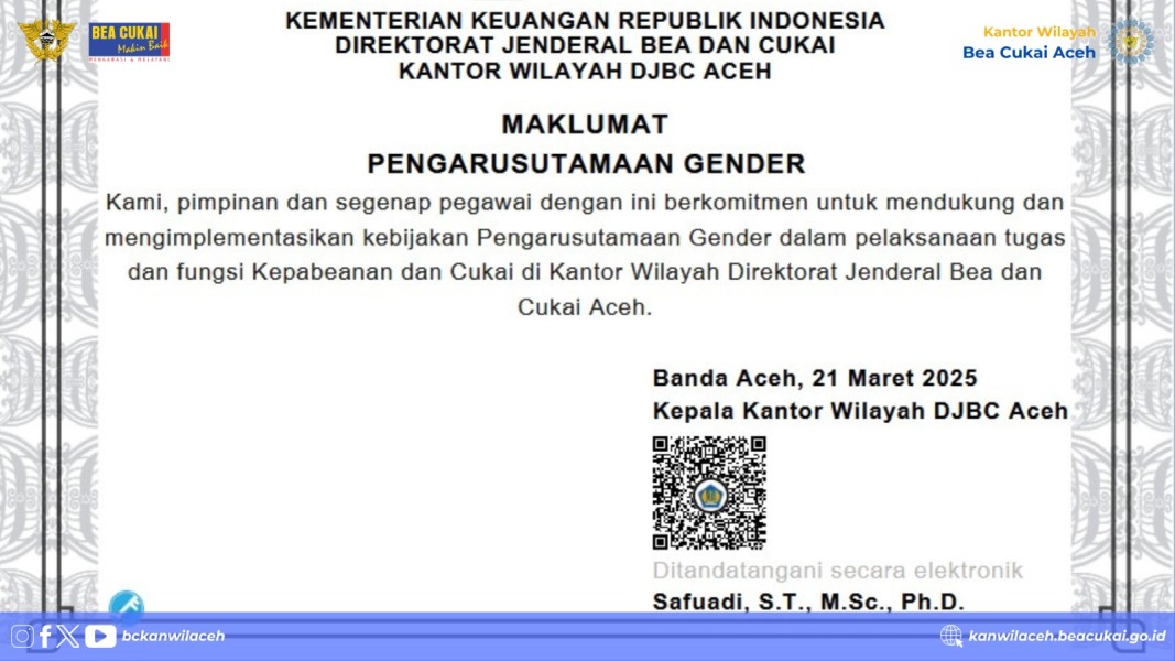 Dalam kegiatan ini, Kepala Kanwil Bea Cukai Aceh, Bapak Safuadi, menegaskan bahwa penerapan PUG bukan hanya sebatas kebijakan, tetapi harus menjadi budaya kerja yang diwujudkan dalam setiap aspek tugas dan fungsi organisasi. Beliau juga membacakan maklumat PUG sebagai bentuk deklarasi komitmen bersama dalam mendukung kesetaraan gender di lingkungan Bea Cukai Aceh.