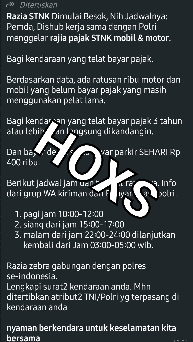 Dalam pesan tersebut disebutkan bahwa razia akan menyasar kendaraan yang belum membayar pajak STNK selama lebih dari 3 tahun, bahkan mengklaim kendaraan yang menunggak akan langsung “dikandangkan” serta dikenakan biaya derek dan parkir hingga Rp 400 ribu per hari.