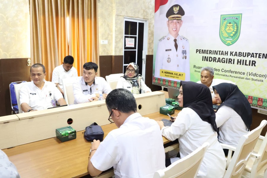 Junaidi Ismail didampingi pejabat terkait, ikuti rapat virtual tersebut pada Rabu (30/4) dari Bilik Video Conference Dinas Kominfopers Inhil.