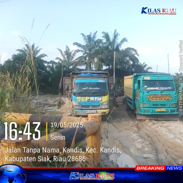 Siak, KILASRIAU.com – Aktivitas tambang pasir ilegal di Kelurahan Kandis Kota, Kecamatan Kandis, Kabupaten Siak, kembali mencuat. Berdasarkan pantauan langsung tim Kilas Riau pada Senin (19/05/2025) pukul 16.43 WIB, dua unit truk pengangkut pasir tertangkap kamera tengah beroperasi di lokasi tanpa plang izin resmi.