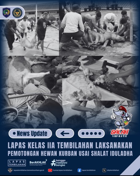 KILASRIAU.com - Sebagai wujud keimanan dan semangat berbagi, Lembaga Pemasyarakatan Kelas IIA Tembilahan melaksanakan kegiatan pemotongan hewan kurban usai pelaksanaan Shalat Iduladha 1446 H di lapangan blok hunian Lapas Tembilahan, Jumat (6/6).