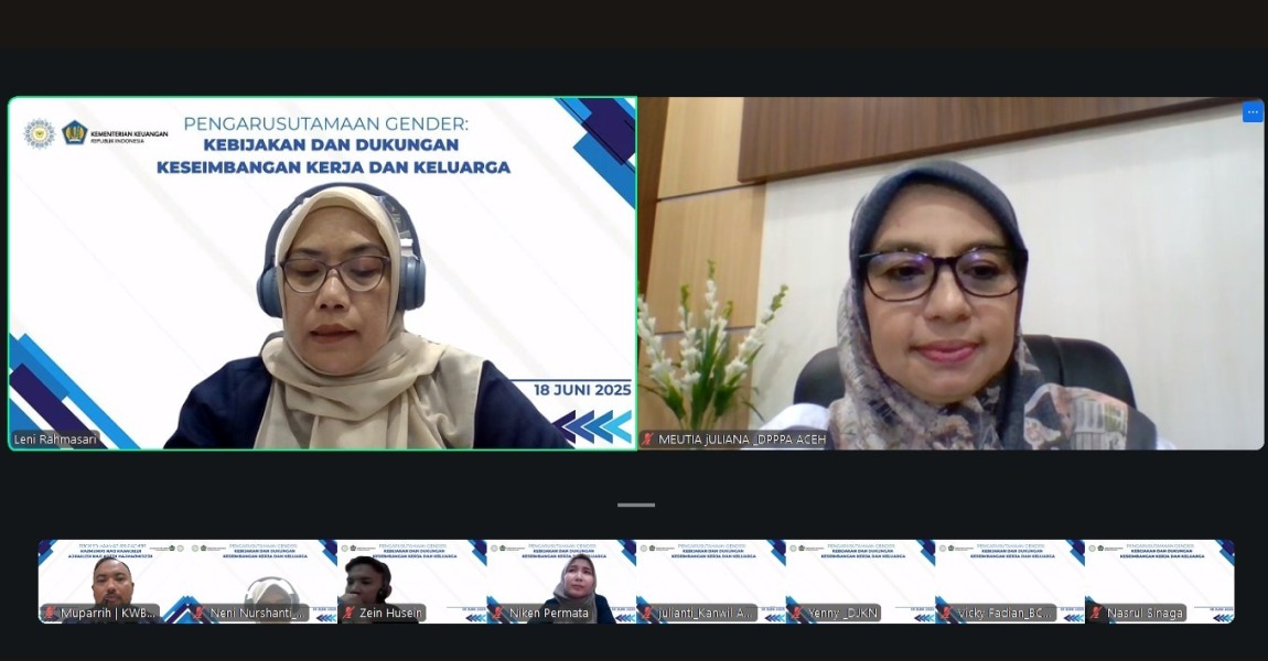 Acara ini menghadirkan narasumber utama Meutia Juliana, S.STP., M.Si, Kepala Dinas Pemberdayaan Perempuan dan Perlindungan Anak (DP3A) Provinsi Aceh, yang menyampaikan materi komprehensif mengenai pentingnya dukungan kelembagaan terhadap perempuan dalam menghadapi peran ganda di ranah domestik dan profesional.