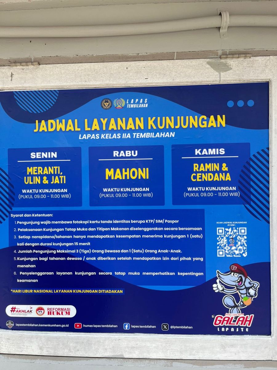 Melihat pemberitaan yang telah beredar tersebut, Kepala Lembaga Pemasyarakatan Kelas IIA Tembilahan, Prayitno, saat dikonfirmasi di ruangan nya, Senin (28/7/25), menjelaskan bahwa layanan kunjungan telah diatur secara spesifik berdasarkan blok hunian narapidana.