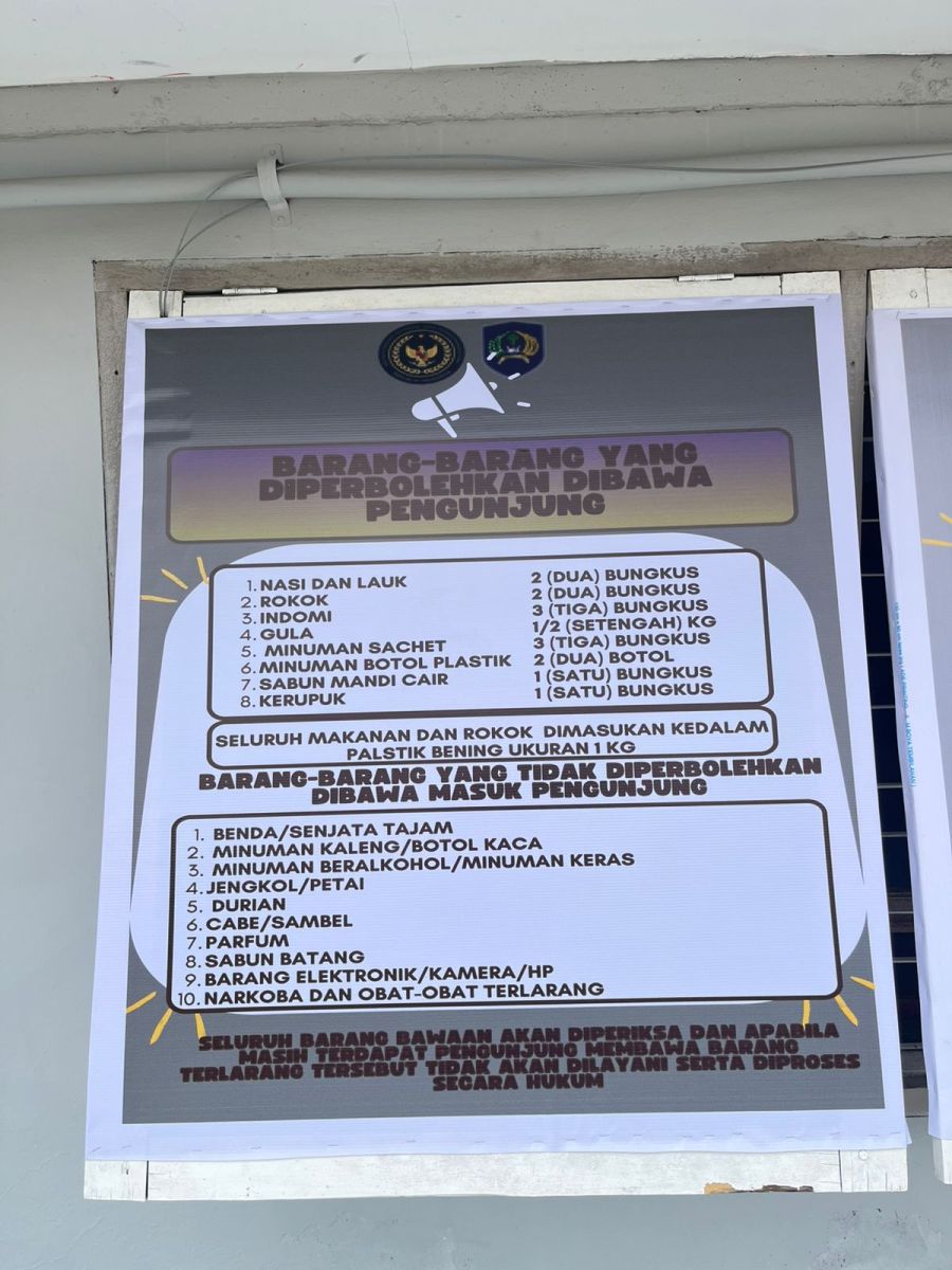 Menurut pengumuman resmi di dinding Lapas, hanya barang-barang tertentu yang boleh dibawa saat kunjungan, seperti Nasi dan lauk (2 bungkus), Rokok (2 bungkus), Indomie (3 bungkus), Minuman sachet (3 bungkus), dan Sabun cair, kerupuk, dan botol plastik (dengan jumlah terbatas).