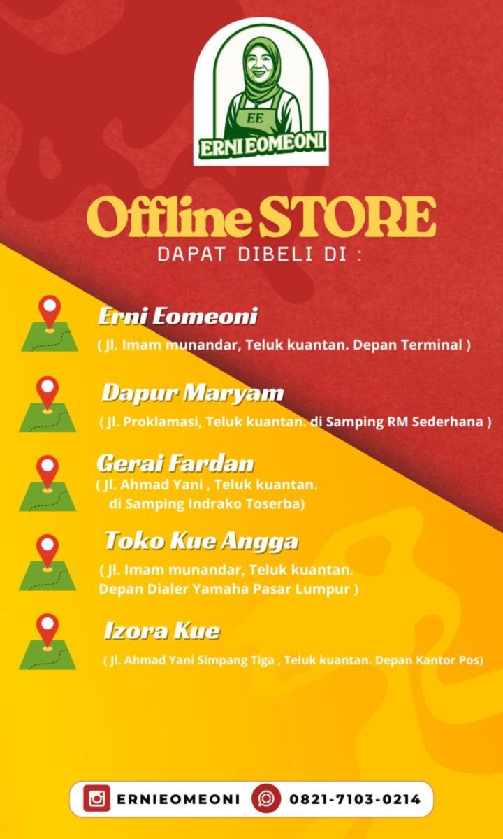 Produk ini telah dipasarkan melalui media sosial dan pemesanan langsung melalui WhatsApp di nomor 0821-7103-0214 . Selain itu, akun Instagram @ernieomeoni aktif mempromosikan berbagai produk turunannya.