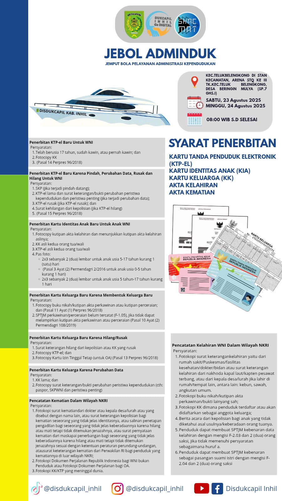 KILASRIAU.com - Dinas Kependudukan dan Pencatatan Sipil (Disdukcapil) Kabupaten Indragiri Hilir (Inhil) akan melaksanakan program Jemput Bola Pelayanan Administrasi Kependudukan (Jebol Adminduk) di Kecamatan Teluk Belengkong.