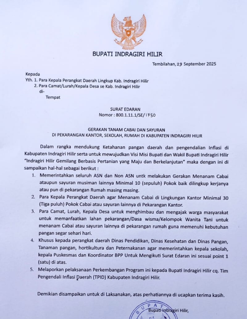 KILASRIAU.com – Bupati Indragiri Hilir (Inhil), Herman, resmi mengeluarkan Surat Edaran Nomor: 800.1.11.1/SE/1750 tertanggal 29 September 2025 yang memerintahkan seluruh Aparatur Sipil Negara (ASN), Non-ASN, hingga masyarakat untuk melaksanakan Gerakan Menanam Cabai dan Sayuran di pekarangan kantor, sekolah, serta rumah masing-masing.