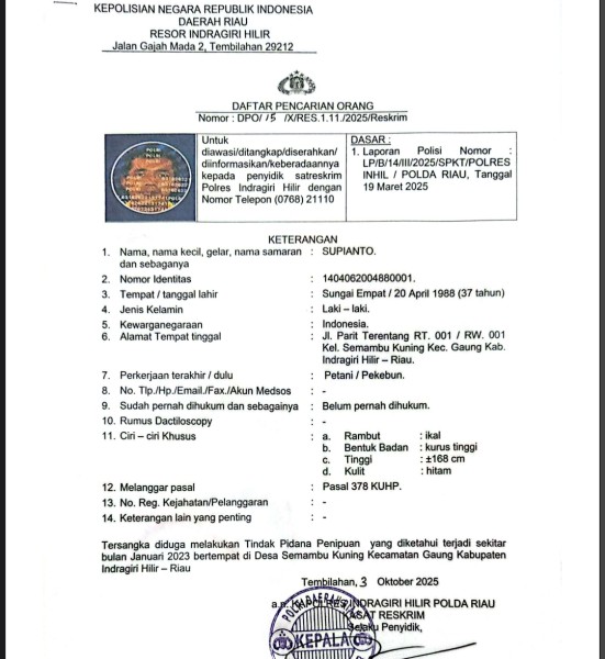 KILASRIAU.com  — Penyidik Polres Indragiri Hilir secara resmi telah menerbitkan Daftar Pencarian Orang (DPO) terhadap seorang tersangka bernama Supianto, yang diduga terlibat dalam kasus tindak pidana penipuan jual beli lahan milik masyarakat di Desa Semambu Kuning, Kecamatan Gaung, Kabupaten Indragiri Hilir.