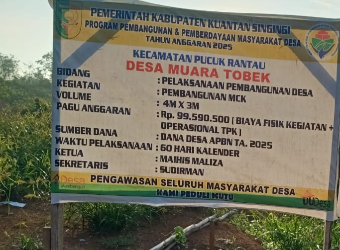 KUANSING (KilasRiau.com) - Proyek pembangunan MCK di Desa Muara Tobek, Kecamatan Pucuk Rantau, Kabupaten Kuantan Singingi (Kuansing), Riau, menuai sorotan publik. Bangunan berukuran kecil yang berdiri di area TK Muara Kasih itu menelan anggaran hingga Rp 99.590.500 dari Dana Desa Tahun Anggaran 2025.